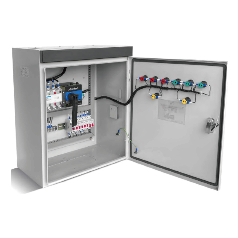 TABLERO DE TRANSFERENCIA AUTOMÁTICA (ATS por sus siglas en inglés: Automatic Transfer Switch) es un complemento de nuestros generadores. Se encarga de monitorear la continuidad de la energía de la red eléctrica. Al momento de identificar un corte de suministro, el equipo ATS envía una señal al equipo, indicándole que debe comenzar a funcionar, y a su vez al detectar la vuelta de la red eléctrica, entrega una señal al generador, deteniendo así su funcionamiento.